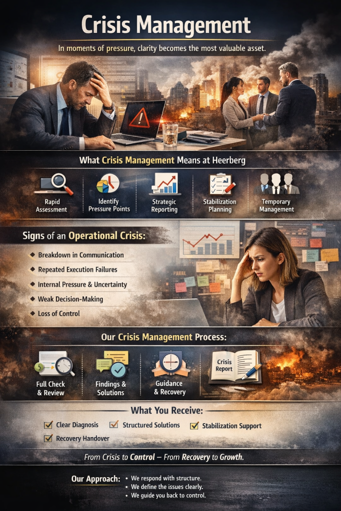 Heerberg provides crisis management for companies that need immediate clarity, operational stabilization and a professional review of what is going wrong.